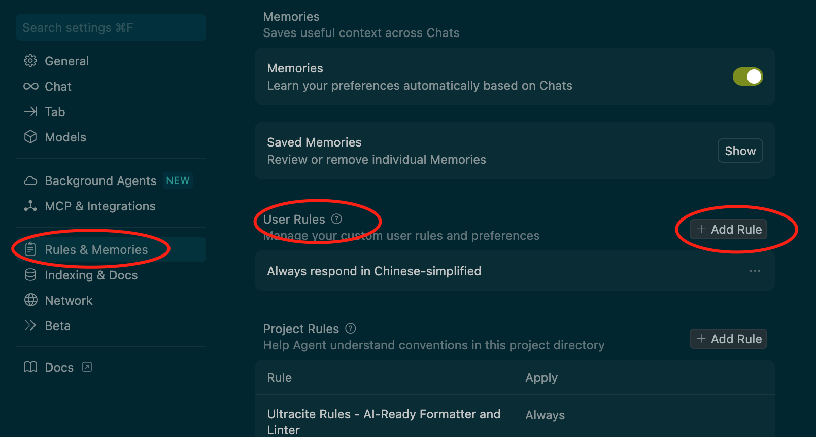 用户规则是在 Cursor Settings → Rules 中定义的全局偏好,适用于所有项目。它们为纯文本格式,适合设置沟通风格或个人编码偏好。