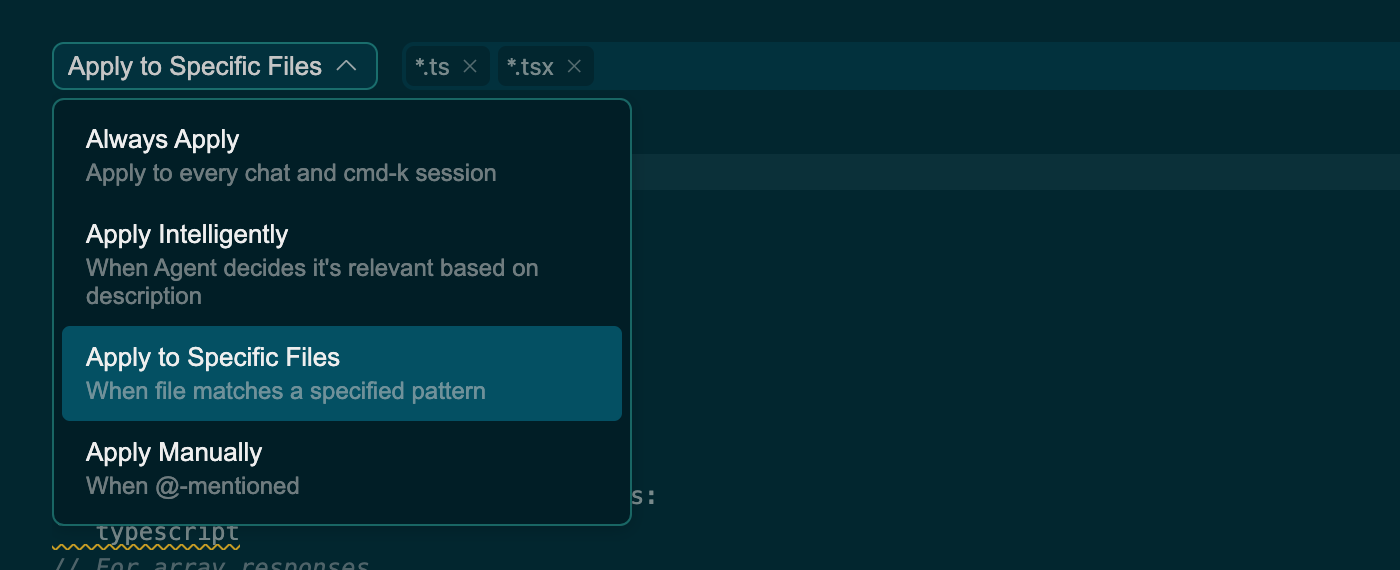 每个规则文件使用 MDC(.mdc) 格式编写,这是一种同时支持元数据与内容的格式。通过规则类型下拉菜单控制规则的应用方式: