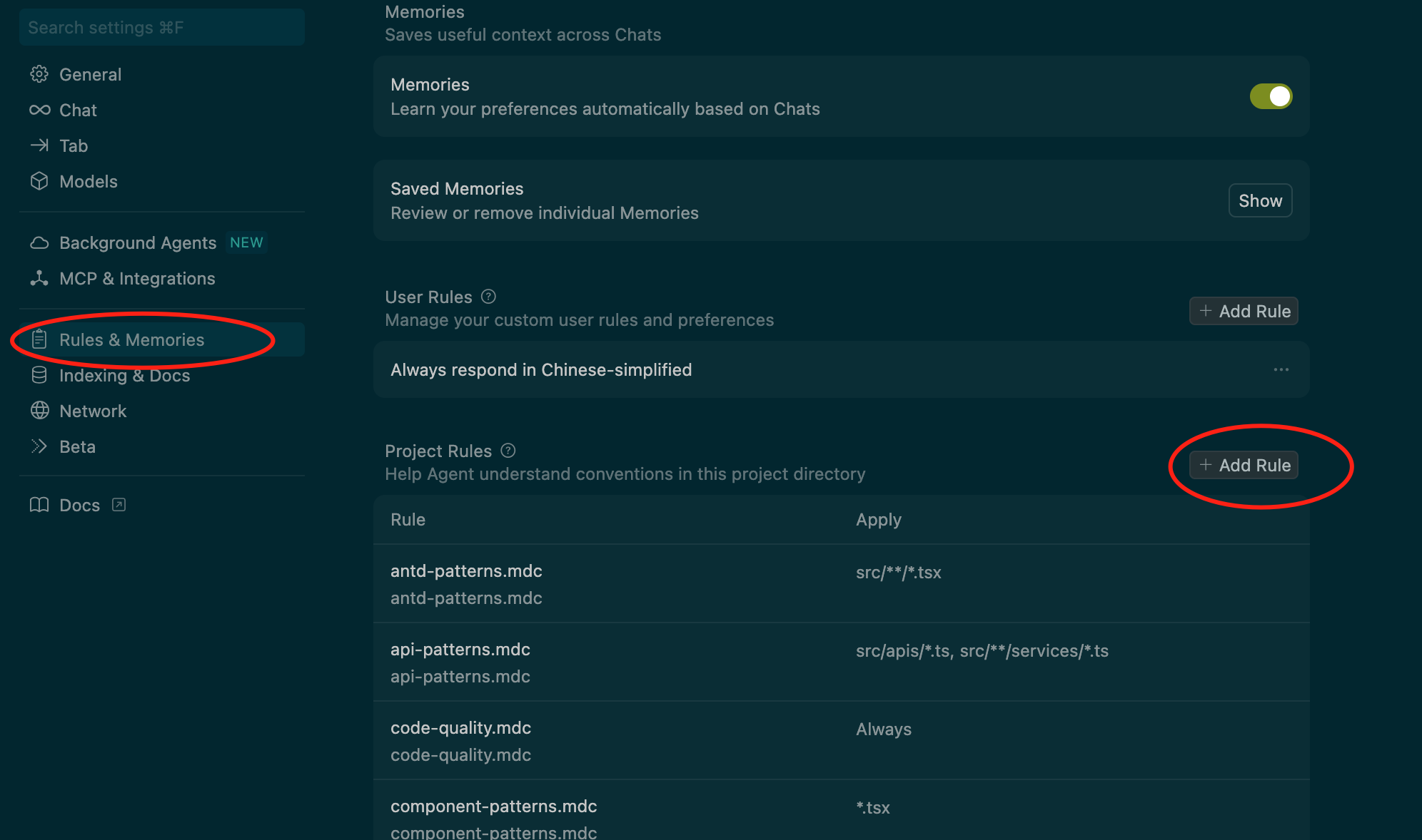 - 优先级最高:Team Rules → Project Rules → User Rules