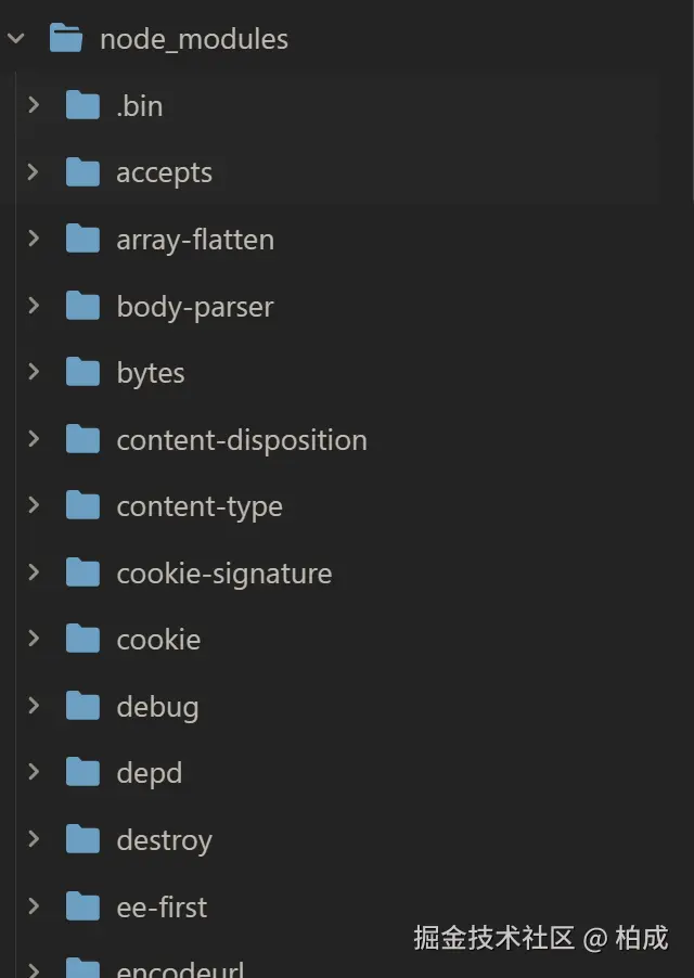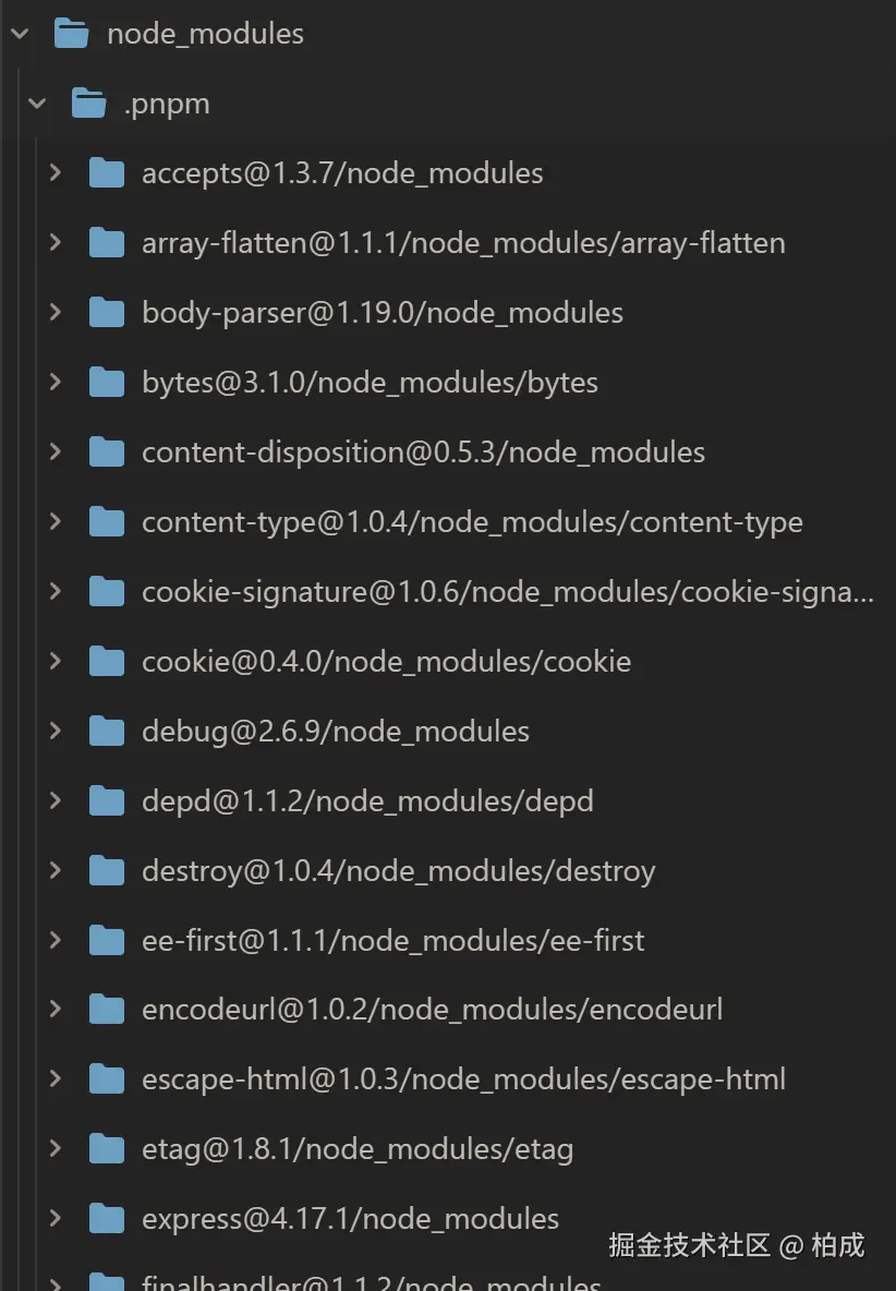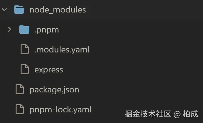 执行 npm add express,我们可以在 pnpm-example 看到整个目录,由于只安装了 express,那 node_modules 下就只有 express