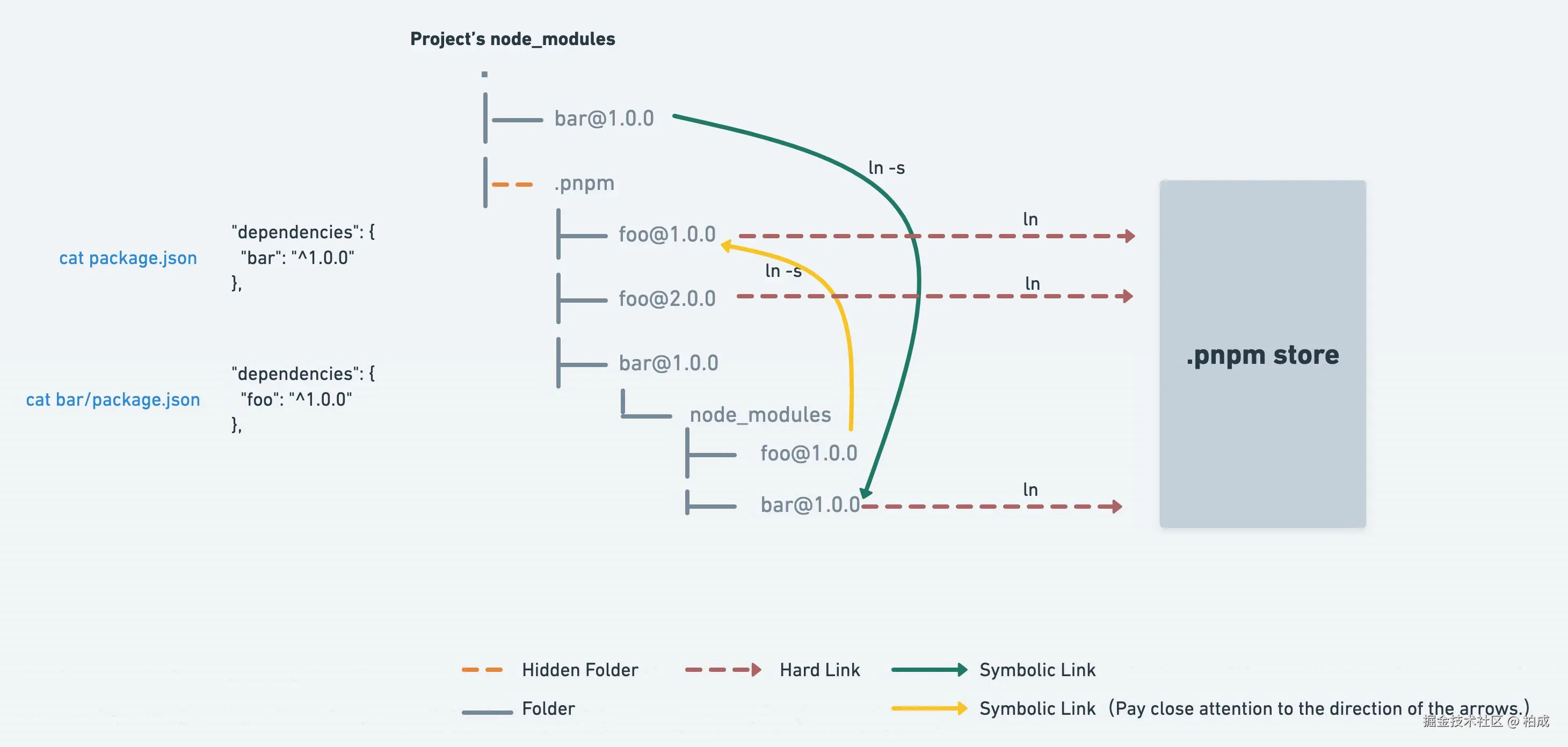 每个项目 node_modules 下安装的包以软链接方式将内容指向 node_modules/.pnpm 中的包。 所以每个包的寻找都要经过三层结构:node_modules/package-a > 软链接 node_modules/.pnpm/package-a@1.0.0/node_modules/package-a > 硬链接 ~/.pnpm-store/v3/files/00/xxxxxx。