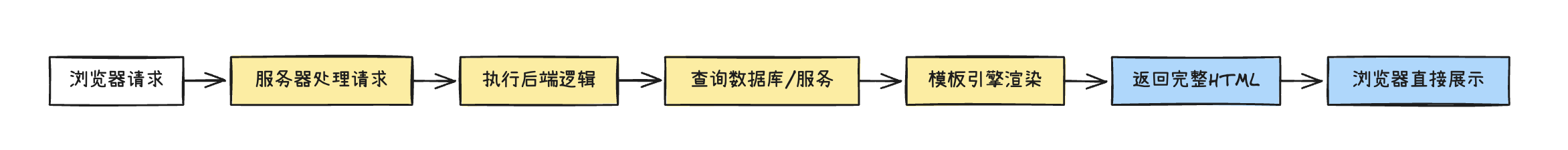 在Web发展初期,前后端尚未分离,传统SSR是主流的渲染方式。使用PHP、JSP、ASP等技术,服务器在每次请求时从数据源获取动态数据,并将数据注入到模板中生成完整HTML返回给浏览器。