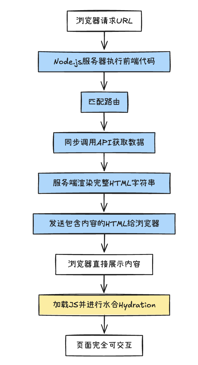 为了平衡CSR的体验问题和SEO需求,同构SSR应运而生。Node.js的出现使得JavaScript可以在服务端运行,实现了"一次编写,两端运行"的同构渲染模式。