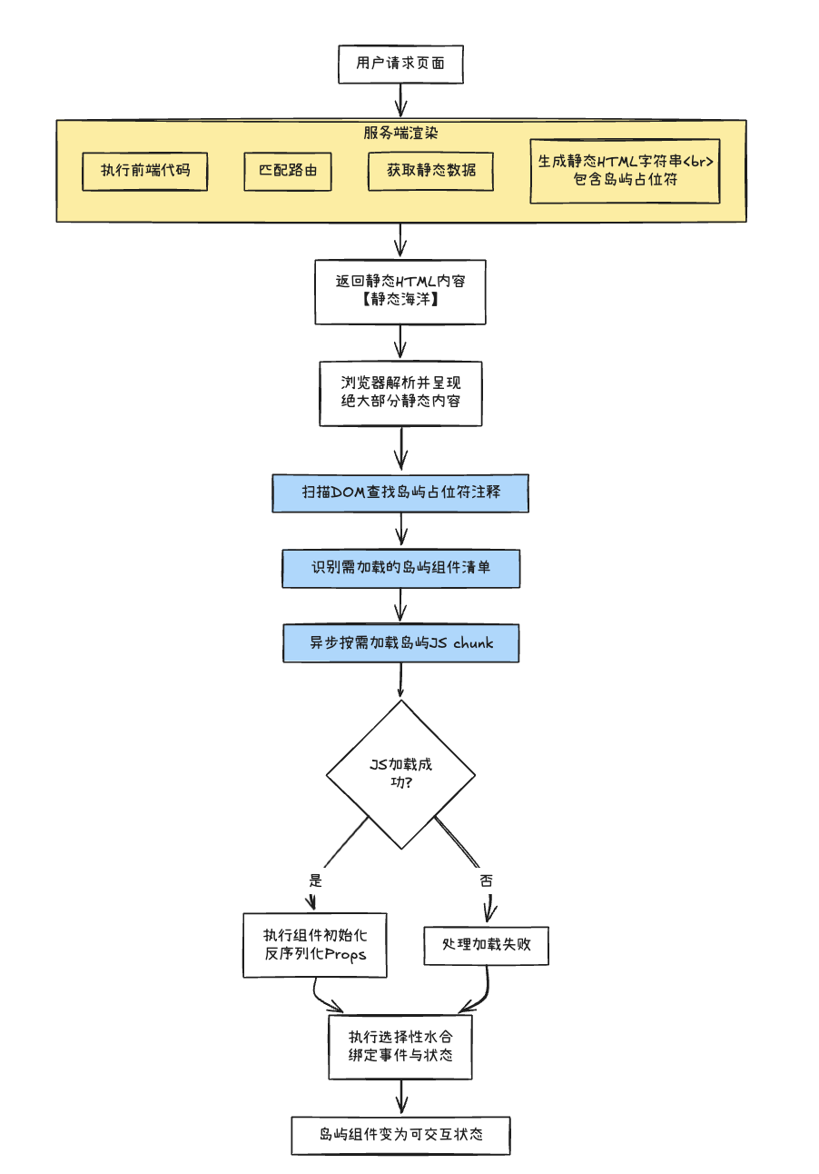 岛屿架构将页面视为由静态内容(如HTML、CSS)构成的“海洋”,其中嵌入的交互式组件(如购物车、搜索框、评论表单)则被视为独立的“岛屿”。这些“岛屿”可以独立加载、渲染和运行,彼此隔离且互不干扰。